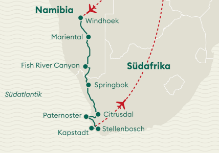 Gewaltige Canyons, einsame Berglandschaften und eines der letzten Urvölker, die die Erde zu bieten hat, prägen die bizarre, ungezähmte Schönheit. Das mit Euphorbien-Sträuchern und gewaltigen, rotgetünchten Basaltbergen gespickte Areal ist Faszination und Ursprünglichkeit zugleich. Unweit des Atlantiks erwarten Sie mit dem Brandbergmassiv die höchsten Gebirgszüge Namibias und ur...